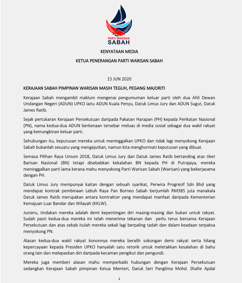 "Kerajaan Sabah mengambil maklum mengenai pengumuman keluar parti oleh ADUN Kuala Penyu, Datuk Limus Jury dan ADUN Sugut, Datuk James Ratib.