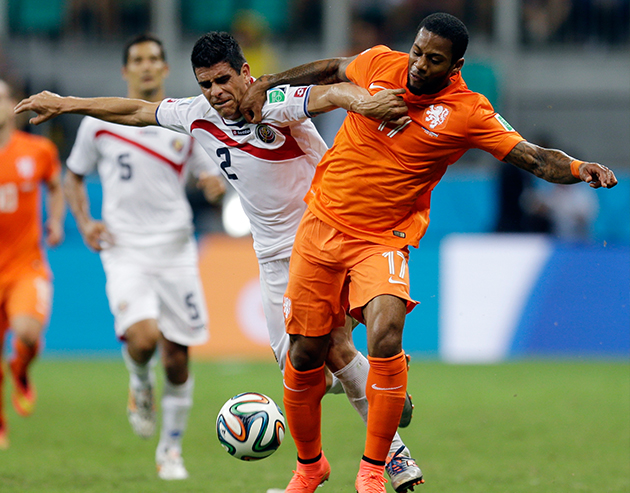 Pemain Costa Rica Johnny Acousta menolah pemain Belanda Jeremain Lens semasa perlawanan mereka di Arena Fonte Nova di Salvador, Brazil. -AP Photo/Natacha Pisarenko