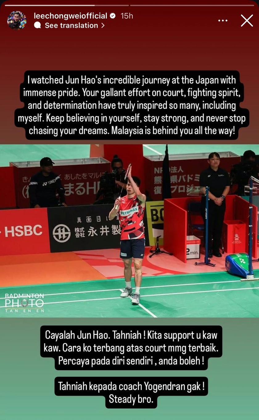 “Saya menyaksikan perjalanan luar biasa Jun Hao di Jepun dengan rasa bangga yang luar biasa. Usaha serta semangat juang yang tinggi dan keazaman penuh kamu benar-benar memberi inspirasi kepada ramai orang, termasuk saya sendiri.