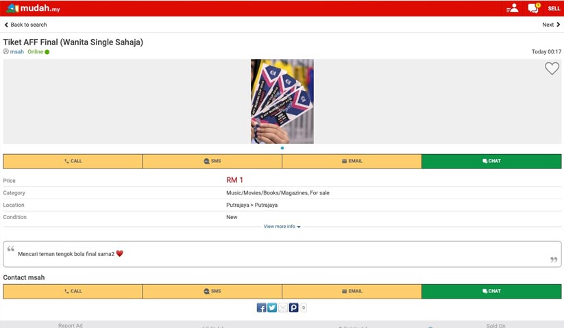 Gara-gara inginkan teman, seorang lelaki sanggup memberikan tiket perlawanan akhir pertama Piala AFF Suzuki 2018 di laman di platform Mudah.my secara percuma.