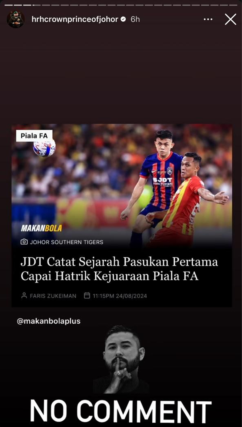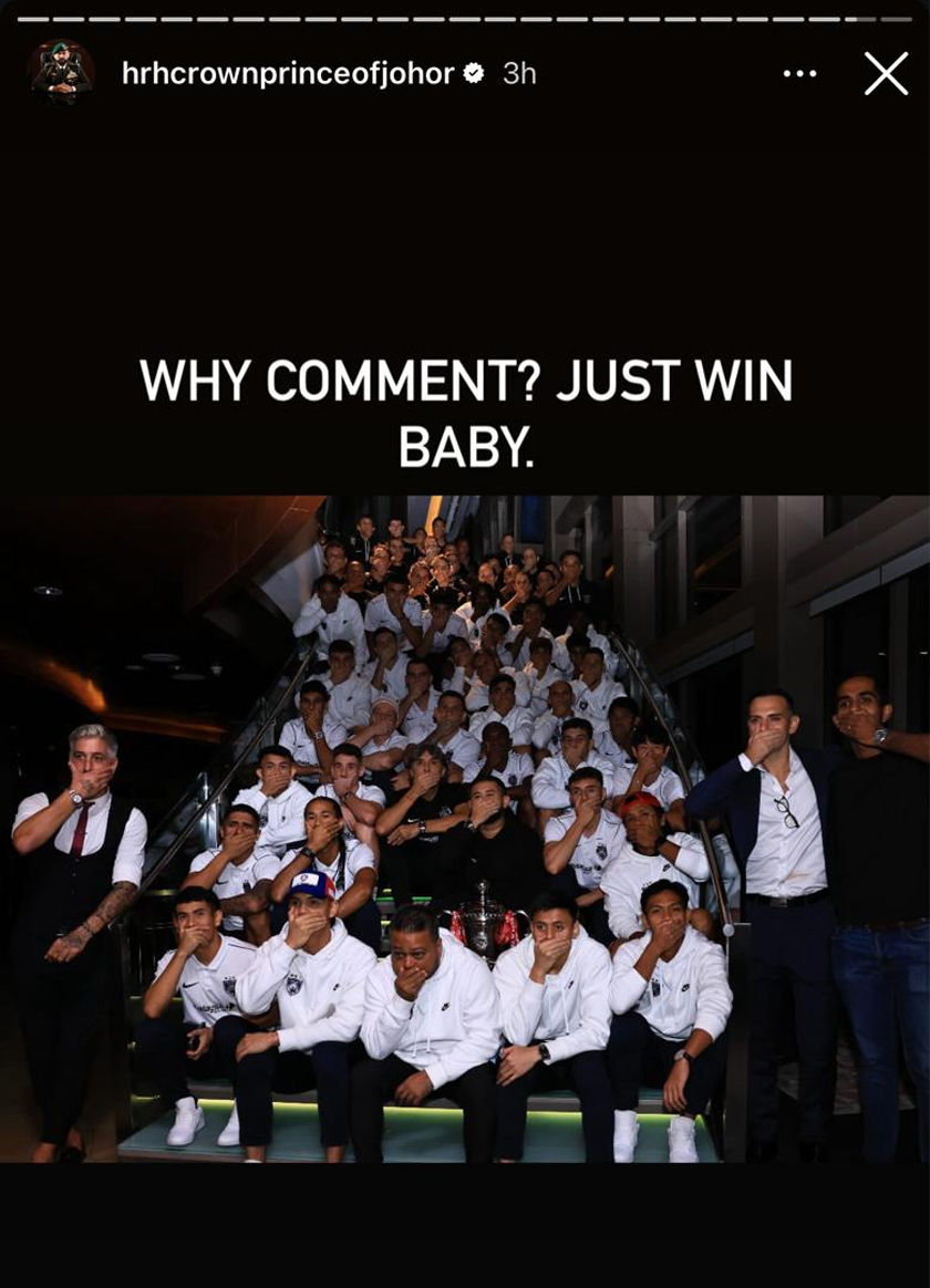 Tunku Ismail yang juga Pemangku Sultan Johor turut berkongsi hantaran bertulis “Why comment? Just win baby…”