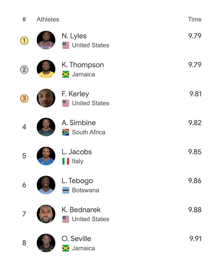 Namun begitu dengan bantuan teknologi kamera halaju tinggi, Noah Lyles pelari dari Amerika Syarikat dinobatkan sebagai pemenang pingat emas dengan catatan masa rasmi 9.784 saat mengalahkan Kishane Thompson dari Jamaica dengan catatan masa 9.789 saat.