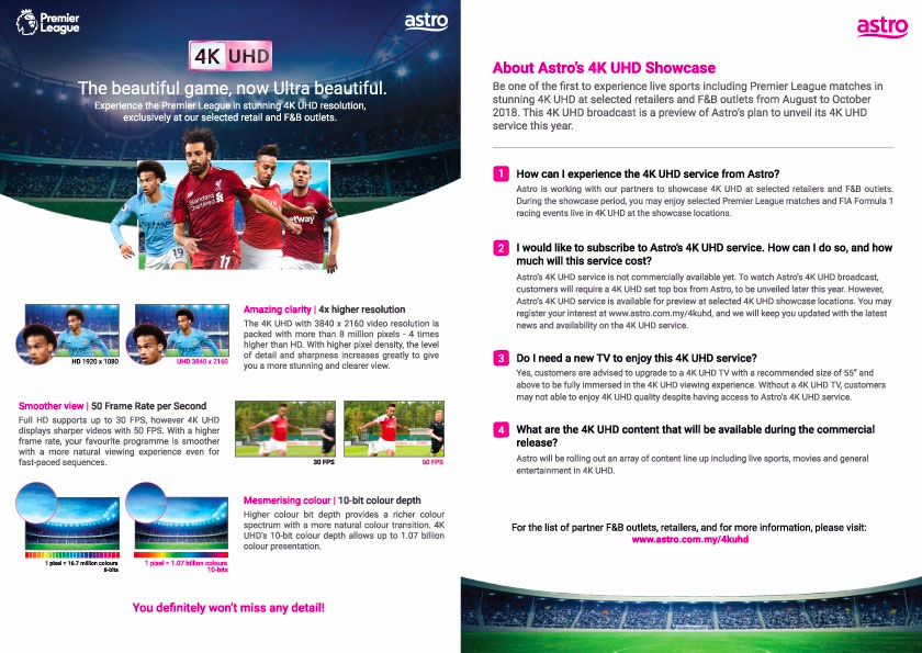 Ketua Bahagian Sukan Astro, Lee Choong Khay berkata Astro menjadi penyiar pertama di Malaysia untuk menyiarkan siaran langsung EPL dalam paparan 4K UHD.