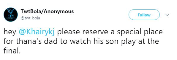 Menerusi media sosial Twitter milik pengguna bernama @twt_bola, mereka menyarankan Menteri Belia dan Sukan, Khairy Jamaluddin untuk menyediakan tempat istimewa buat bapa Thanabalan.