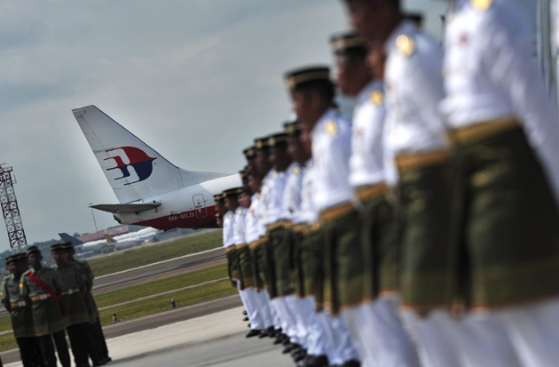A Malaysia Airlines plane passes by as Malaysian army personnel conduct the final rehearsal for the National Day of Mourning at the Bunga Raya Complex at KLIA. - Astro AWANI/Shahir Omar