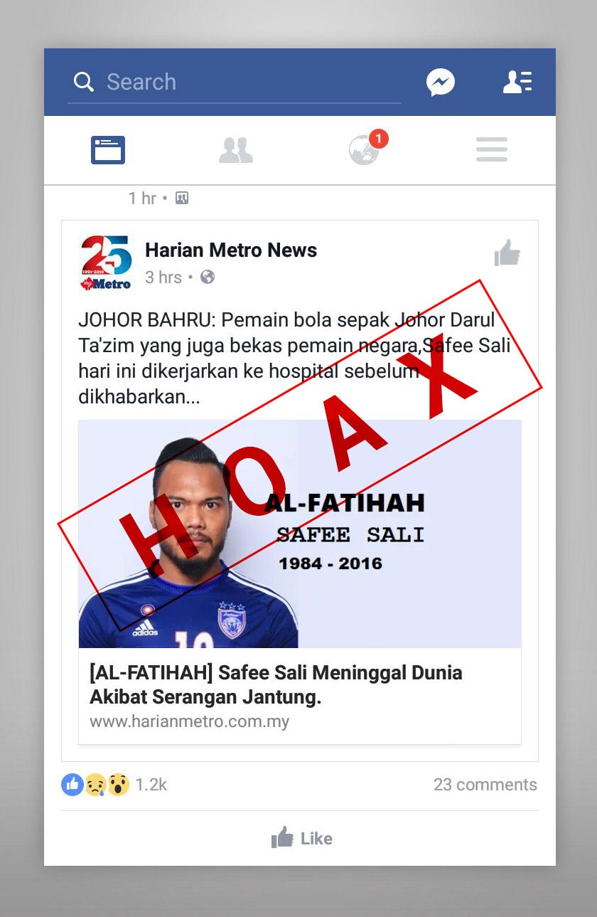 Earlier today, a screen capture of an image purportedly from a local news portal claiming that the 32-year-old has died was widely shared on social media, including WhatsApp.