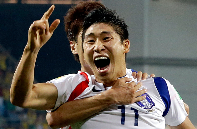 South Korea's Lee Keun-ho celebrates after scoring the opening goal during the group H World Cup football match between Russia and South Korea. -AP Photo/Lee Jin-man