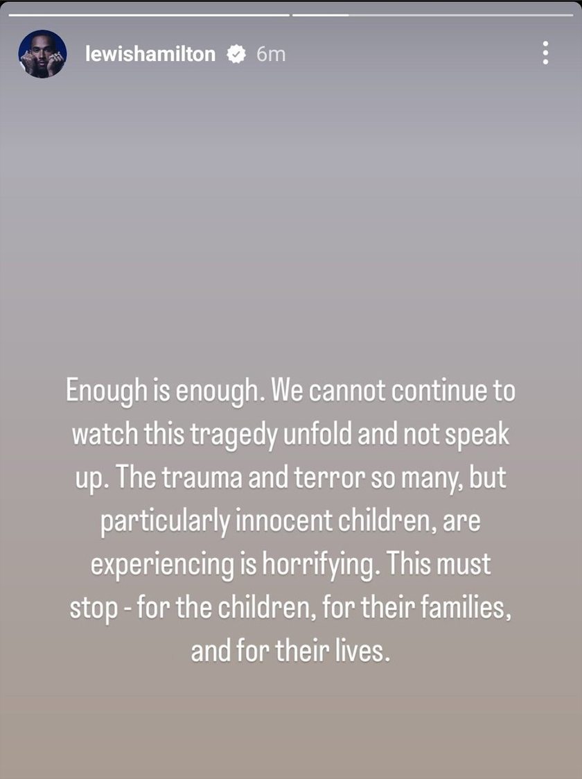 "Cukuplah. Kita tidak boleh terus melihat tragedi ini berlaku dan tidak bersuara. Trauma dan keganasan yang dialami terutamanya kanak-kanak yang tidak berdosa, amat mengerikan. Ini mesti dihentikan; untuk kanak-kanak, untuk keluarga mereka, dan untuk mereka terus hidup," pemandu Mercedes berusia 39 tahun dari United Kingdom itu meluahkan perasaannya menerusi Instagram Story pada 29 Mei lalu.