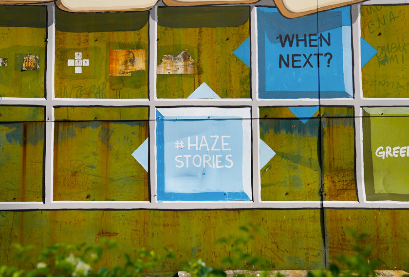 Sekali pandang, ia bagaikan papan permainan 'gergasi' Scrabble dengan perkataan ''Transboundary Haze' (Jerebu Rentas Sempadan) tertera di atasnya di samping beberapa perkataan lain termasuk 'sekolah tutup', 'clean air', 'udara bersih' dan 'end air pollution'.