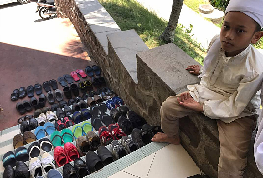 Amin, 12 tahun, kelihatan sibuk menyusun kasut-kasut jemaah di tangga Masjid Bandar Kota Kinabalu.