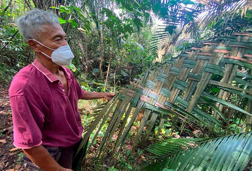 "Satu daripada bahan binaan rumah kami adalah daun pokok bertam ini yang digunakan sebagai atap. Daunnya kalis air," jelasnya, menambah sebelum dianyam, daun bertam tersebut perlu diasapkan bagi melembutkan struktur daun.