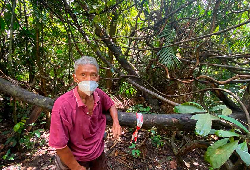Di atas tanah, kelihatan buah kerdas yang sudah terkupas - sekali imbas seperti buah berangan - bertaburan, iaitu sumber aroma tengik yang kami bau.