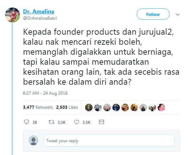 "Kepada 'founder' dan jurujual, takda salah kalau nak mencari rezeki, tapi janganlah sampai menjejaskan kesihatan orang lain.