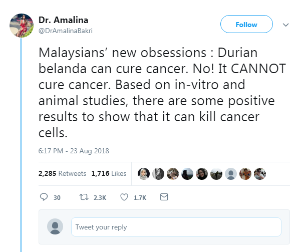 MENERUSI akaun Twitter, pelajar cemerlang SPM tahun 2004, Dr Amalina Bakri tampil membuat kenyataan menafikan dakwaan kebanyakan rakyat Malaysia yang mengatakan jus durian belanda mampu merawat kanser.