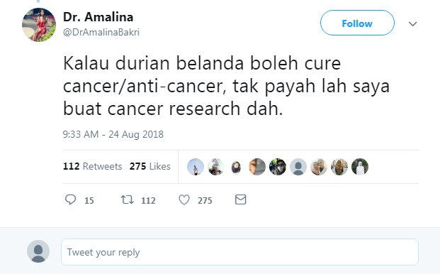 "Kalau durian belanda boleh rawat kanser, tak payah lah saya buat penyelidikan kanser," tulisnya.