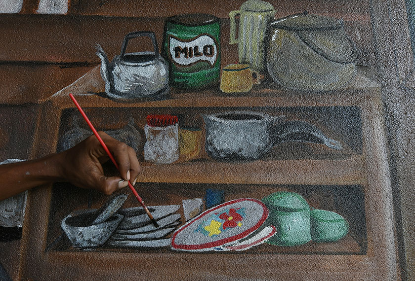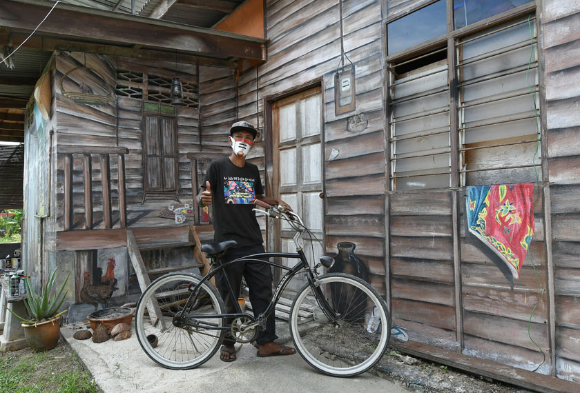 Lukisan mural di dinding bengkel berkeluasan sembilan meter lebar dan tiga meter tinggi itu berjaya menarik perhatian netizen kerana selain rumah kayu, ia turut memaparkan suasana zaman dahulu dengan tandas pintu zink, ampaian, pokok kelapa, burung, ayam ternakan, kain batik dan tempayan di tepi tangga rumah.