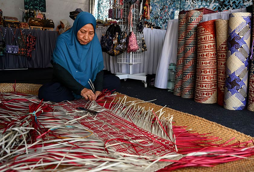 KUALA TERENGGANU: Di satu sudut reruai Kraftangan Malaysia pada Program MADANI Rakyat (PMR) Terengganu, kelihatan seorang wanita berusia begitu tekun menjalin helaian daun mengkuang berwarna menjadi sehelai tikar.