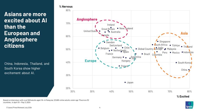 Satu kajian Ipsos yang meliputi 32 negara telah mendedahkan bahawa walaupun rakyat Malaysia teruja dengan potensi AI, kebimbangan tentang jaminan pekerjaan dan kadar perubahan teknologi juga berleluasa.