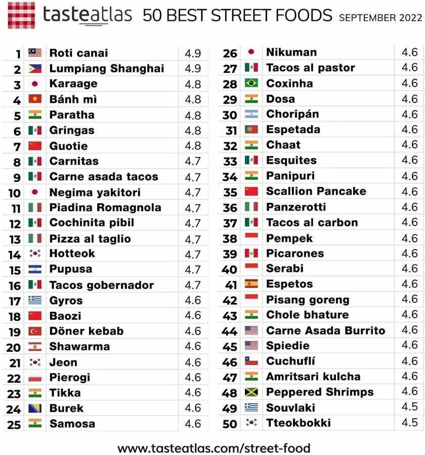 Senarai 50 jenis makanan antarabangsa itu turut disertai hidangan jalanan popular lain, antaranya seperti pizza al taglio dari Itali, negima yakitori (Jepun), doner kebab (Turkiye), serabi (Indonesia), spiedie (Amerika Syarikat), shawarma (Lubnan), dan coxinha (Brazil).