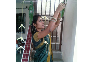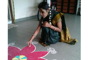 Kami bermula dengan membersih dan menghiasi dengan mengikat daun mangga di halaman rumah serta lukisan 'kolam’ di anjung menggunakan beras berwarna.
