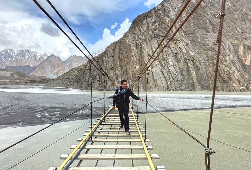 Dikenali sebagai antara jambatan paling berbahaya di dunia, binaan tergantung yang merentangi Sungai Hunza ini menghubungkan kampung Hussaini dan Zarabad di seberangnya. Usaha baik pulih telah dijalankan di jambatan ini, namun masih mengekalkan 'ciri khas' iaitu papan pijak yang sengaja dijarakkan, demi identiti 'ngeri'nya! Kalau tidak mahu melangkah di jambatan ini, cubalah rentasan 'zip-line'... membawa anda 'melayang' terus ke seberang.