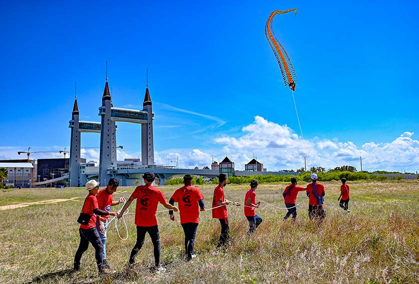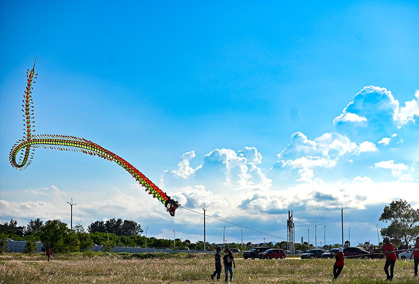 KUALA TERENGGANU: Seorang penjawat awam bukan sahaja mengambil masa selama setahun untuk menyiapkan satu wau berbentuk seperti naga, malah memerlukan bantuan seramai 15 lelaki dewasa untuk menerbangkannya di Dataran Jambatan Angkat di sini.