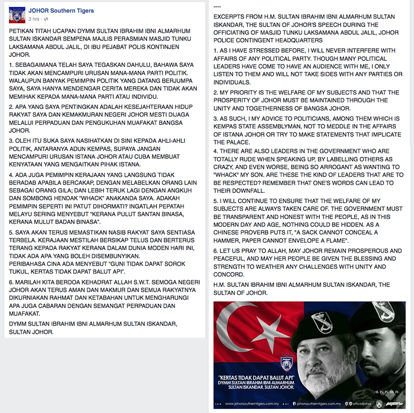 His speech had also been posted on the official Facebook page of the Johor Southern Tigers.